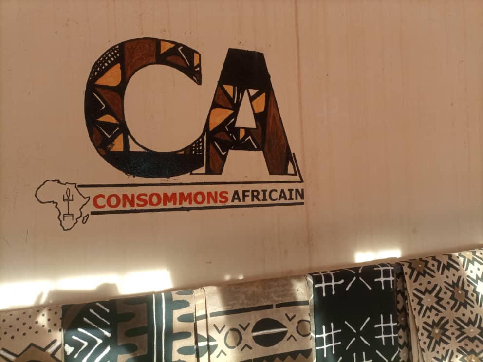 Dès la devanture de son atelier est affiché le slogan « CA », dessiné sur le mur en motif Bogolan : CA comme Consommons Africain. Sous un hangar, avant d’accéder à sa boutique, on voit étalés sur une tôle pagnes et chemises bogolan. Et voici Aboubacar Touré, tee shirt blanc au logo CA, pantalon jean, tenant un bidon de teinture : avant même de parler avec lui, on comprend que le natif de Gao vit et pense bogolan depuis toujours. Le bogolan, c’est sa passion, c’est l’air qu’il respire…