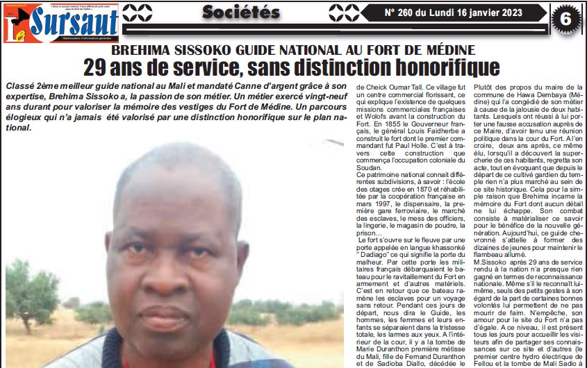 Aujourd’hui c’est la volonté de transmettre son savoir à la nouvelle génération qui l’anime. Le guide chevronné a ainsi formé une dizaine de jeunes qui reprendront le flambeau. Entièrement dévoué à sa tâche, Bréhima Sissoko avoue ne s’être véritablement pas soucié d’assurer ses vieux jours. Si bien qu’aujourd’hui, après 29 ans de services rendus à la nation, il ne vit que de l’argent reçu de personnes de bonne volonté qui le gratifient en fonction de leurs moyens. Malgré ces lendemains incertains, il continue d’être présent tous les jours pour accueillir les visiteurs et leur faire partager son savoir encyclopédique sur, non seulement, le fort de Médine mais aussi tous les faits marquants de l’histoire passée et récente de la région : de la première centrale hydroélectrique de Fellou, à la tombe de Mali Sadio à Bafoulabé. Notre guide chevronné caresse cependant un rêve ultime : se voir décernée une médaille de reconnaissance par les autorités de la transition avant son dernier souffle.