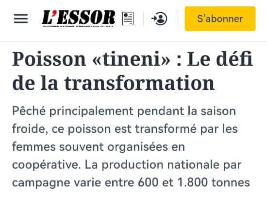 Organisées en coopératives, elles assurent le broyage du poisson, la cuisson et l’extraction de l’huile qu’elles conditionnent en bidons de 20 à 30 litres. Elles sèchent le Tinèni en l’exposant au soleil. Séché, il est utilisé comme « bouillon » dans la sauce, nous informe le directeur national adjoint de la Pêche. Sa production, ajoute-t-il, qui ne dure qu’un petit moment, est estimée entre 600 à 1800 tonnes par campagne sur l’étendue du territoire national.