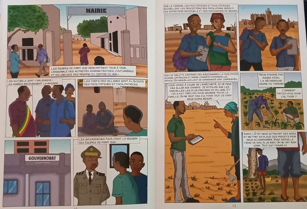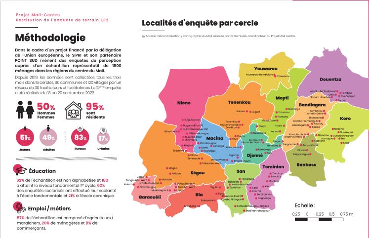 Les enquêtes ont été menées auprès d’un échantillon de 1800 enquêtés dans quatre régions (Ségou, Bandiagara, Mopti, Douentza), dont 50% d’hommes et femmes, 58% d’adultes, 42% de jeunes/Parmi les autres chiffres significatifs : 95% sont résidents des régions concernées, 18% sont des urbains et 82% des ruraux, avec 56% d’agriculteurs, 11% de commerçants, 4,6% de salariés, 2,4% d’éleveurs et 1,4% de pêcheurs.