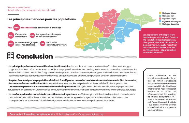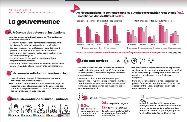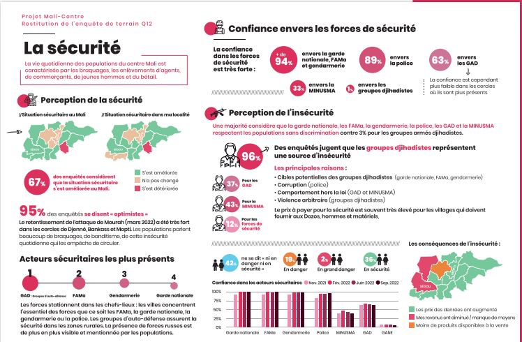 Sur une telle diversité, les statistiques globales ont-elles un sens ? Selon Virginie Baudais, directrice du programme Sahel et Afrique de l’Ouest du SIPRI, « la perception de l’amélioration de la situation sécuritaire s’est accrue d’une manière générale sur le plan national. Mais quand on regarde au niveau des cercles les réalités sont totalement différentes. A Ténenkou, Bankass et Mopti les perceptions sont très différentes d’un cercle comme Baraouéli. ». Entre deux localités proches, les résultats peuvent être très différents « parce l’une a des services sociaux et l’autre non, des autorités administratives ou non, dans un cas les gens peuvent se rendre dans leur champ ou au marché hebdomadaire ou non, etc. »