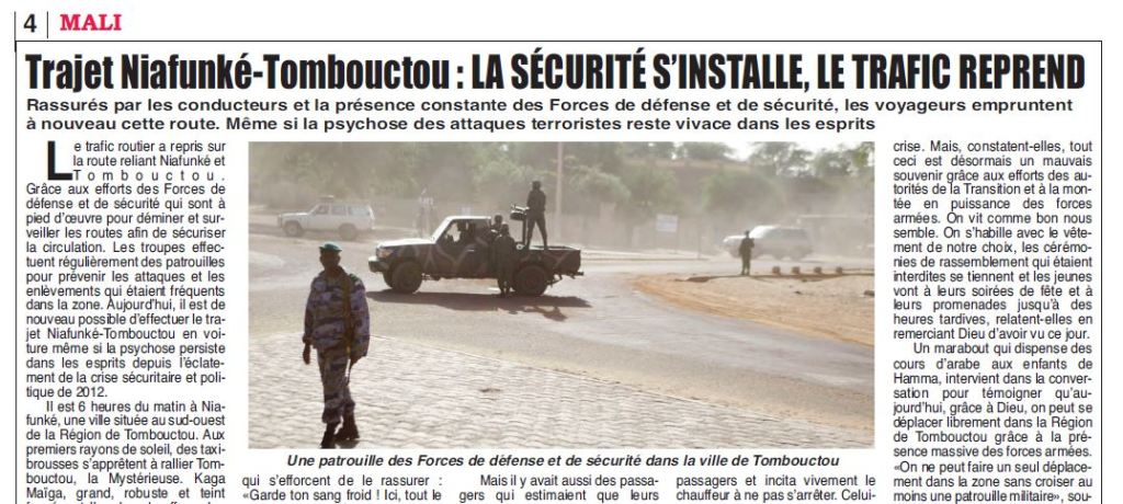 Laissons le soin à Khalifa Konaté de tirer la conclusion de cette journée qui a débuté dans l’appréhension et s’achève dans l’optimisme. Il le fait le sourire aux lèvres : « Maintenant, je suis sûr qu’il ne m’arrivera rien du tout. Et je m’aperçois que tout ce que les gens me racontaient sur la zone sont fausses rien qu’en voyant les forces armées mobilisées sur la route et dans la ville ».