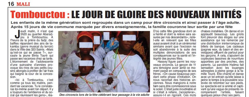 Dans les rues, ils croisent et côtoient des gens qui émergent des ruelles, arborant leurs plus beaux atours. Les femmes portent les parures caractéristiques de leurs ethnies (sonrhaï, tamasheq, maure et arabe). Les hommes sont drapés dans de grands boubous, la tête et le cou couverts par un turban assorti. C’est la famille Touré qui reçoit les invités du jour. Une dizaine d’enfants circoncis de 10 à 15 ans déjà là, sont vêtus de bazin blanc et coiffés de bonnets rouges. L’œil attendri, la mère d’un de ces garçons calcule que quinze jours ont été nécessaires pour que les enfants se rétablissent afin de vivre cette cérémonie qui consacre leur passage au statut d’adulte. « Ce n’était pas facile au début. Certains d’entre eux pouvaient supporter la douleur tandis que d’autres nous réveillaient à des heures tardives parce qu’ils avaient trop mal », précise Oumou, visiblement heureuse de vivre ce grand rituel.