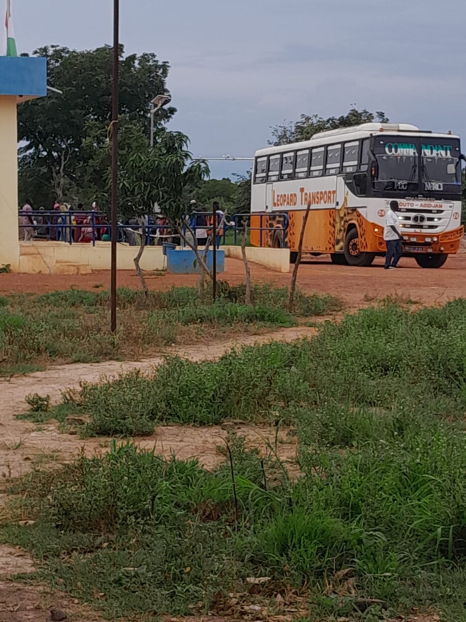 La distance entre Bamako et Abidjan fait plus de 1100 km. Pour l’affronter, des passagers se sont ravitaillés en diverses denrées dont la plupart sont faites-maison. Cette précaution les met à l’abri de risques d’intoxication liés à la consommation d’aliments généralement jugés malsains. Le bus arrive à Kacoli, dernier village malien avant de rentrer en territoire ivoirien, à 14 heures. Passer le poste de contrôle qui s’y trouve est, selon les habitués de ce trajet, une «épreuve». À notre arrivée, de nombreux bus attendaient impatiemment leurs passagers qui passaient le contrôle.